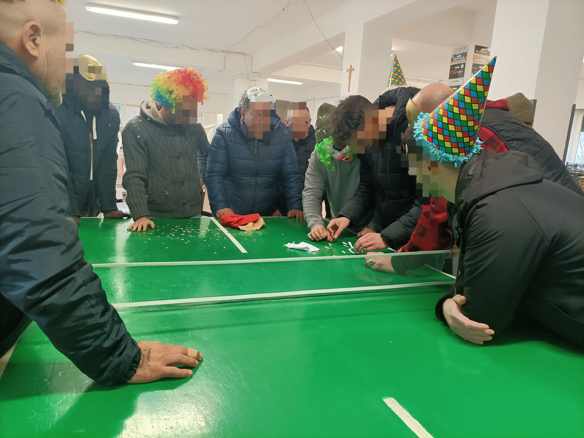 Nel corso degli incontri i partecipanti, con un numero variabile di presenze, hanno preso parte con interesse e coinvolgimento alle diverse attività proposte. Utilizzando materiali messi a disposizione dalla struttura (cartoncini colorati, tempere, colla vinavil, carta, stagnola), i ragazzi hanno realizzato maschere personalizzate attraverso la tecnica del calco del viso, attività nata anche su loro proposta. Parallelamente sono state create sagome decorative, festoni, stelle filanti e addobbi per gli spazi comuni, contribuendo attivamente all'allestimento della struttura in vista della festa.