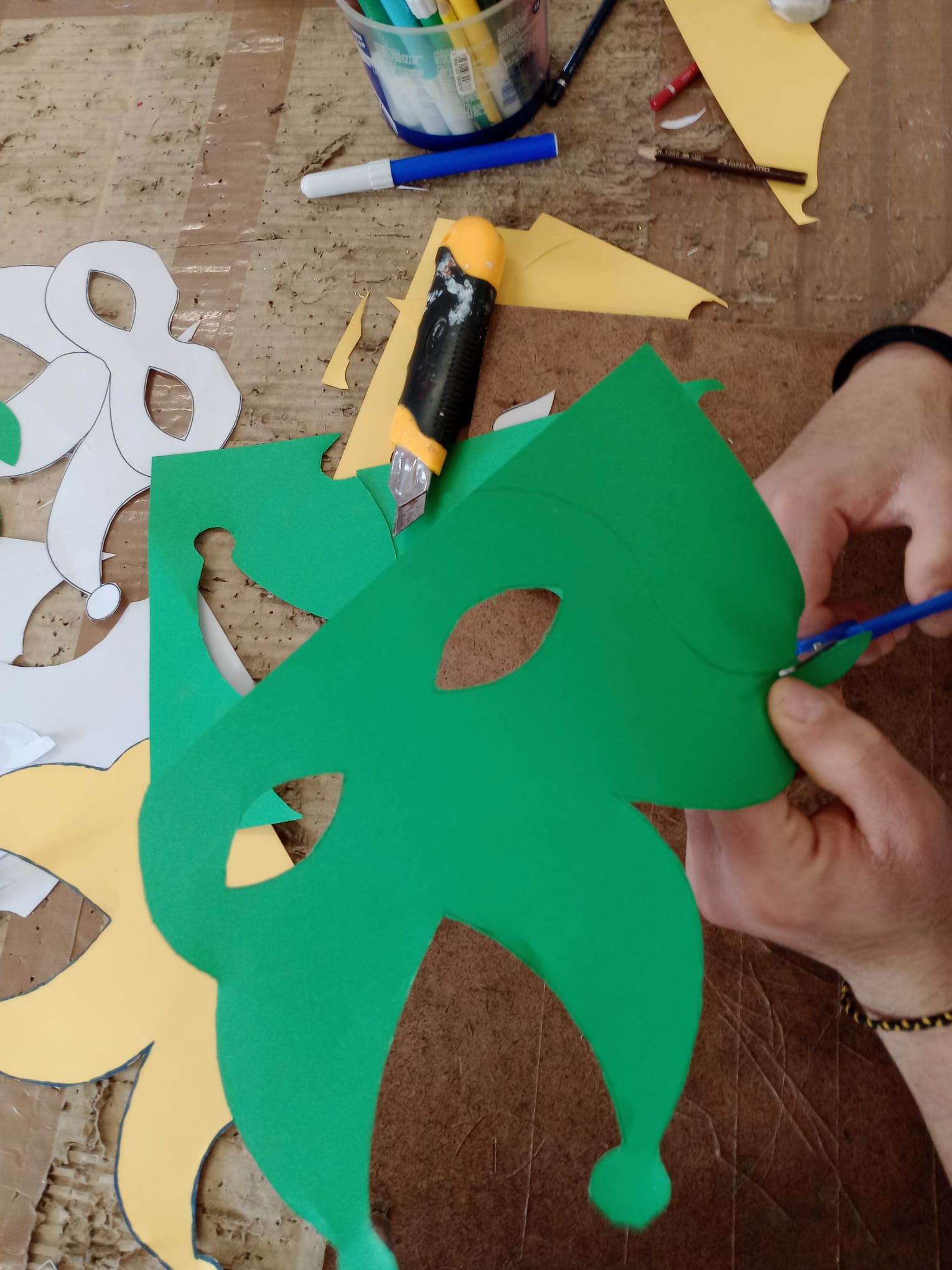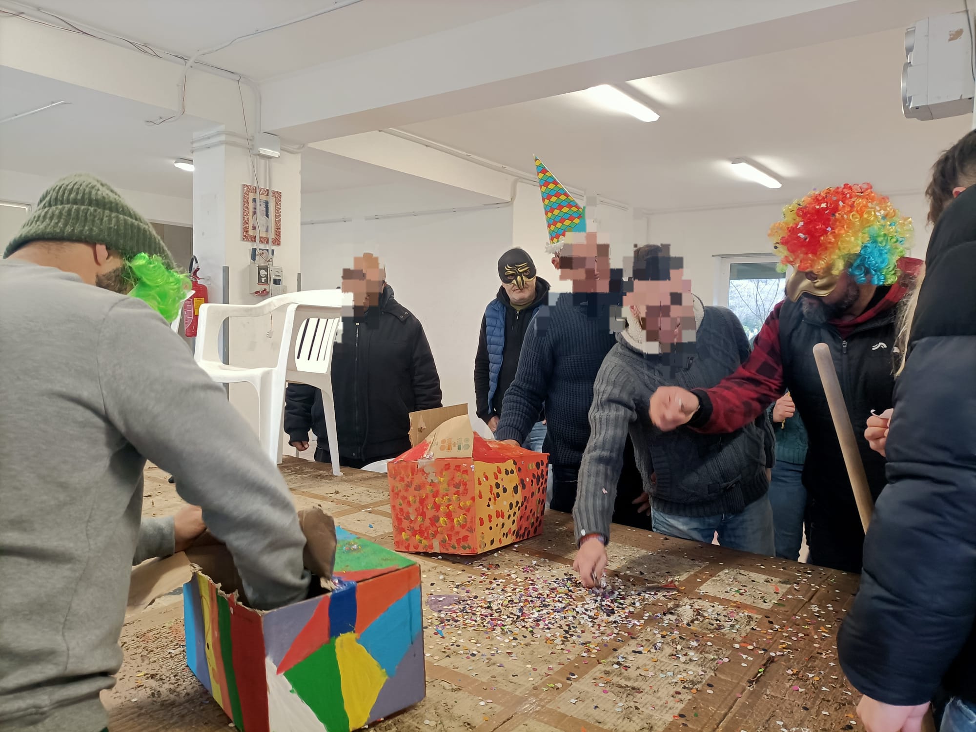 Nel corso degli incontri i partecipanti, con un numero variabile di presenze, hanno preso parte con interesse e coinvolgimento alle diverse attività proposte. Utilizzando materiali messi a disposizione dalla struttura (cartoncini colorati, tempere, colla vinavil, carta, stagnola), i ragazzi hanno realizzato maschere personalizzate attraverso la tecnica del calco del viso, attività nata anche su loro proposta. Parallelamente sono state create sagome decorative, festoni, stelle filanti e addobbi per gli spazi comuni, contribuendo attivamente all'allestimento della struttura in vista della festa.